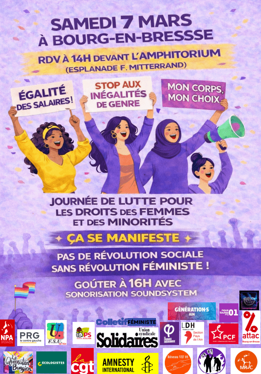 Associations, syndicats et organisations politiques de gauche s’unissent pour organiser, à Bourg en Bresse, la journée de lutte pour les droits des femmes :